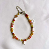 Armband Adventure, met vrolijke, heldere en pastel kleuren door elkaar in oranje, rood, roze en geel. De steentjes hebben vele verschillende vormen, dat maakt de armband heel speels, avontuurlijk en blij!