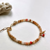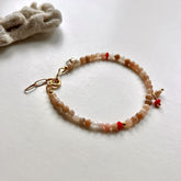 - De armband Endless Story, zonnesteen, lichtroze opaal, witte parel en rode koraal