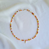 Ketting Adventure, met vrolijke, heldere en pastel kleuren door elkaar in oranje, rood, roze en geel. De steentjes hebben vele verschillende vormen, dat maakt de ketting heel speels, avontuurlijk en blij!