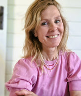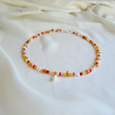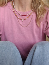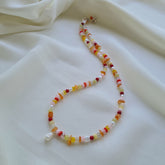 - De ketting Adventure, in de kleuren rood, roze, geel, oranje, met de edelstenen parel, koraal, agaat, carneool, rozekwarts