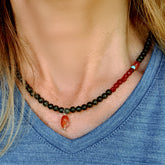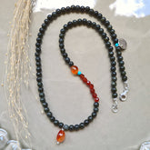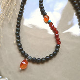 - De ketting Danielle, met zoisiet, agaat en carneool edelsteentjes in donkergroen en oranjerood