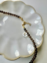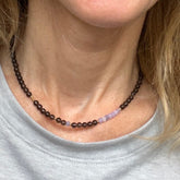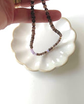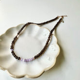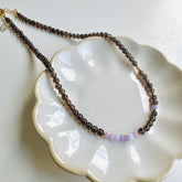 Ketting Let it Go, een fijn minimalistisch kettinkje met geslepen edelsteentjes in warme kleuren in krachtig donkerbruin en licht lila. Rookkwarts is een prachtige warme kleur, waar het lila een speels effect bij geeft. Het kettinkje wordt verpakt in een bewaaretui, dat je makkelijk mee kunt nemen, en je ketting goed beschermt. De edelsteentjes rookkwarts zijn glad en glanzend rond, de lila jade steentjes zijn facet geslepen en een beetje onregelmatig, dat geeft een speels sparkle effect.