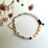- Het armbandje Basic Instinct, met zoetwater parels, onyx en labradoriet edelsteentjes in grijs, zwart en wit