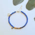Secret Blue is een helderblauw armbandje met fijne edelsteentjes in helder blauw, bruin en zwart. De gladde ronde lapis lazuli, zwarte onyx en gouden tijgeroog edelsteentjes passen heel natuurlijk bij elkaar, een enkel tijgeroog kubusje is een speelse onderbreking.