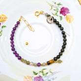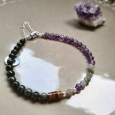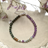 - Het armbandje Friends met paarse amethist, grijze labradoriet en donkergroene zoisiet