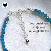 Goed meten is écht belangrijk, om te voorkomen dat hij te smal of te wijd is, of dat je de armband niet over je hand kunt schuiven. Lees hier hoe je polsmaat op te meten, of wat te doen als de armband een verrassing is voor iemand anders. Samengevat: met een touwtje glad om je pols, of met een andere armband kun je de juiste maat opmeten. Let op, de polsomvang is niet de armband maat (polsomvang is ongeveer 2 cm kleiner). En als je het niet precies weet, kies dan voor maat S, M of L, zodat je altijd 3 cm speling hebt dankzij het verlengkettinkje.