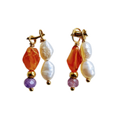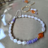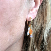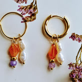 1 Dubbele bedel Lilac Smile, met glanzende hangers in oranje en lila tinten, en zoetwater parels. De oranje carneool edelsteentjes zijn als een ruit gevormd. De lila jade steentjes zijn facet geslepen en glanzen. Een vrolijke oorbel waar je instant blij van wordt! De bedel wordt verpakt in een kleine bewaaretui, dat je makkelijk mee kunt nemen.