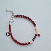 - Het enkelbandje Breeze met granaat, rozekwarts en carneool edelsteentjes in donkerrood, roze en oranje