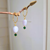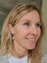 Oorbellen Amelie, met half-doorschijnende hangers in lichtblauw en groen. De edelsteentjes zijn natuurlijk rond gevormd, en glanzen zacht aan je oren. het helder groene jade steentje is een fijn contrast, een mooi detail waardoor ze opvallen. Geen steen is hetzelfde dus elk paar oorbellen is weer net anders.