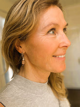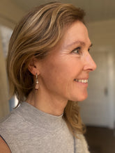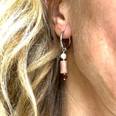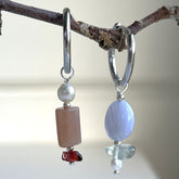 - Oorbellen Blue Whisper, met witte zoetwater parel, zalmroze zonnesteen en donkerrode granaat