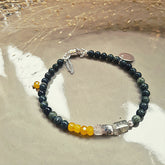 Donkergroene zoisiet contrasteren leuk bij het warme geel van de agaat 4 mm edelsteentjes. Hematiet kwarts verbindt deze stenen door zijn lichtroze en fijne zwarte lijntjes, dit is een bergkristal met ingesloten hematiet. De verschillende vormen van de kralen maken het geheel een beetje stoer. Met sterling zilveren slotje. Het armbandje wordt verpakt in een kleine bewaaretui, dat je eenvoudig meeneemt op reis, en je armband beschermt.