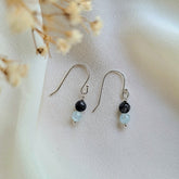 1 bedel Cheerful met hangers in grijze-lichtblauwe tinten. De labradoriet edelstenen zijn grijs, en het ronde aquamarijn is heel zacht lichtblauw. Elke hanger is net anders.
