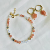 - De armband Sunny Stone, met labradoriet, zonnesteen en parels in de kleuren zalmoranje en grijs