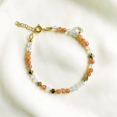 Sun & Moon is een zonnig armbandje met zonnesteen, labradoriet en maansteen. Het warme oranje van zonnesteen heeft een sparkle in de edelsteentjes. De maansteentjes hebben een kattenoogeffect, en een parelmoerachtige glans die lijkt te golven. Soms is deze glans blauw, daarom wordt dit kristal blauwe maansteen genoemd.