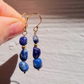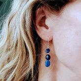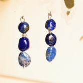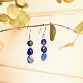 1 Goudvergulde bedel Hidden Blues, met opvallende hanger, 3,4 cm, in heel veel wit-blauwe tinten. De edelsteentjes lapis lazuli hebben blauwtinten van diep donkerblauw, tot doorzichtig lichtblauw, dus heel verschillend, en glanzen aan je oren! Geen steen is ooit hetzelfde, dus elk paar is weer net anders. Met een certificaat waar de symboliek van de kristal op staat beschreven.