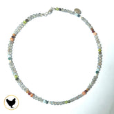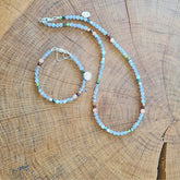 - De ketting en armband Happy Vibes, met labradoriet, zonnesteen en diverse andere edelsteentjes in heldere kleuren