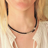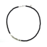 Fancy is een stoer zwart kettinkje met fijne edelsteentjes in matte, zwarte onyx, grijze labradoriet en witte parel edelsteentjes. Het is zo'n heerlijk basis kettinkje dat je nooit meer af doet!