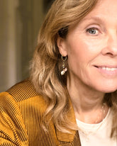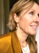 - Oorbellen Peace of mind, met bruine toermalijn, witte maansteen, zalmkleurige zonnesteen, en oranje granaat edelsteentjes in bruine en witte tinten