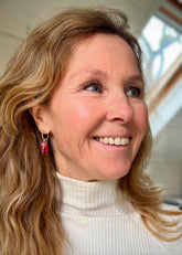 Deze opvallende oorbellen Pink love met dubbele hangers van 2,5 cm zullen je zoveel plezier geven! Je kunt ze op verschillende wijzes dragen. Ze zijn vrolijk helder rood met roze, de roze toermalijn is groot, half doorschijnend, en geven de oorbellen iets chics. Ze zijn heel licht, slechts 2,3 gram per oorbel.