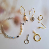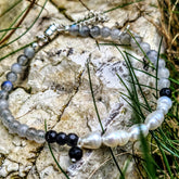 - Het armbandje Basic Instinct, met zoetwater parels, onyx en labradoriet edelsteentjes in grijs, zwart en wit