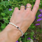 Basic Instinct is een hele fijne basis armband met grijze labradoriet met een blauw-iriserende glans, witte onregelmatige zoetwater parels, en een paar zwarte onyx steentjes. Eenvoudig en heel fijn te combineren bij al je outfits en andere armbandjes. Het is een minimalistisch en stoer armbandje tegelijk. Met een duurzaam massief zilveren (.925) slotje.