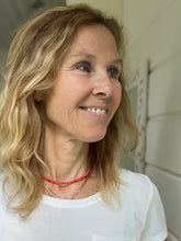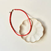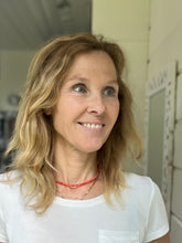 Ketting Happiness een ketting met heldere tinten rood, waar je meteen happy van wordt! Stralend rode koraal in platte schijfjes die een beetje facet geslepen zijn, waardoor ze glanzen. Met een massief sterling zilveren of goudverguld karabijnslotje. Het fijne kettinkje wordt verpakt in een vilten bewaaretui, dat je makkelijk mee kunt nemen, en je ketting beschermt.