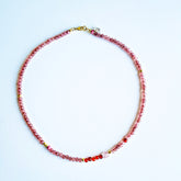 - De ketting Sweet Dreams met edelstenen agaat, aardbeienkwarts, rhodoniet en aardbeienkwarts in warme bruine, oranje en lichtroze kleuren