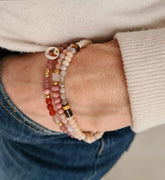 - Het armbandje Sweet Dreams, met edelstenen agaat, aardbeienkwarts, rhodoniet en aardbeienkwarts in warme bruine, oranje en lichtroze kleuren