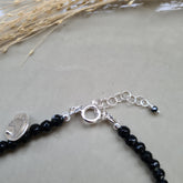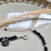 Een sierlijk enkelbandje in zwart en grijs, met een massief zilveren slotje en edelsteentjes onyx, agaat en jaspis. De zebra jaspis dankt haar benaming aan de mooie zwartgrijze streepjes op de edelsteentjes. De onyx is facet geslepen en heeft een mooie glans. Het leuke armbandje wordt verpakt in een kleine bewaaretui, dat je makkelijk mee kunt nemen, en je sieraad beschermt.