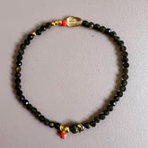 Jacky Moments Growth verwijst naar de betekenis: ontwikkeling, groei, de symboliek van zwarte goud obsidiaan. Kleine goud-zwart gemeleerde edelsteentjes van 3mm, mooi glanzend facet geslepen. Ze hebben een diepe donkergroene glans, niet alleen maar zwart, dat maakt het armbandje zo levendig. Een paar rode koraal beads en een lichtgele citrien maken het luchtig en vrolijk.