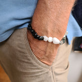 De armband Hidden Leaf heeft witte, groene en zwarte edelsteentjes, die natuurlijk gevormd zijn. Het lichtgroene prehniet heeft zwarte vlekjes, maansteen is een beetje doorzichtig en heeft soms een wat blauwige glans. Een paar donkergroene india agaat steentjes maken de armband mooi aards van kleur.
