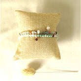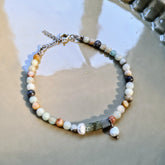 Het enkelbandje Liefde & Vriendschap met veelkleurig amazoniet, parel en hematietkwarts edelsteentjes