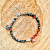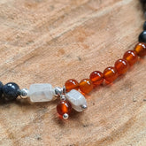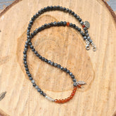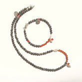 - De armband en ketting Autumn, met labradoriet, en agaat in de kleuren oranje en donkergrijs