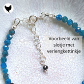 Beide sieraden hebben massief sterling zilveren slotjes. Bij het armbandje is er de keuze tussen een magneetslotje met veiligheidskettinkje, of een slotje met verlengkettinkje (3 cm langer te maken, zie maten S, M. L).